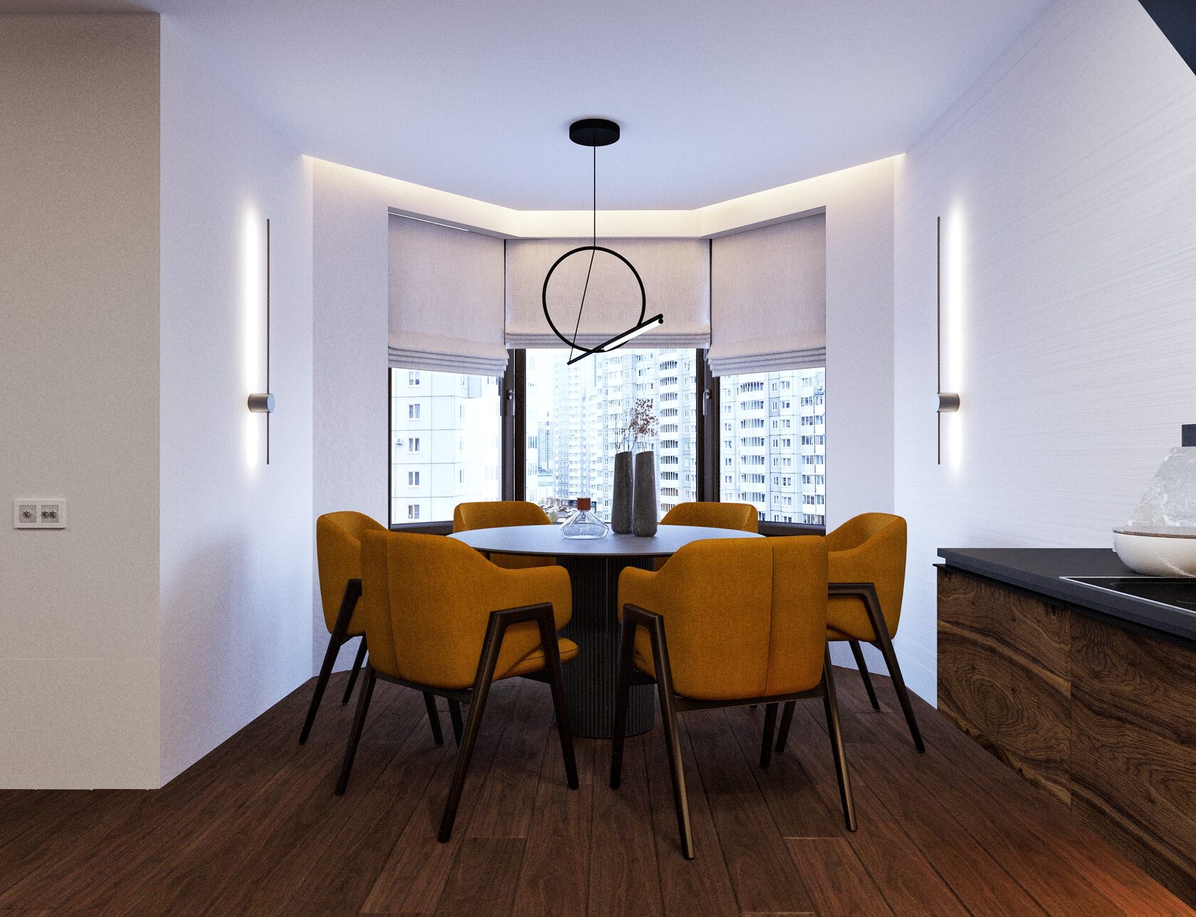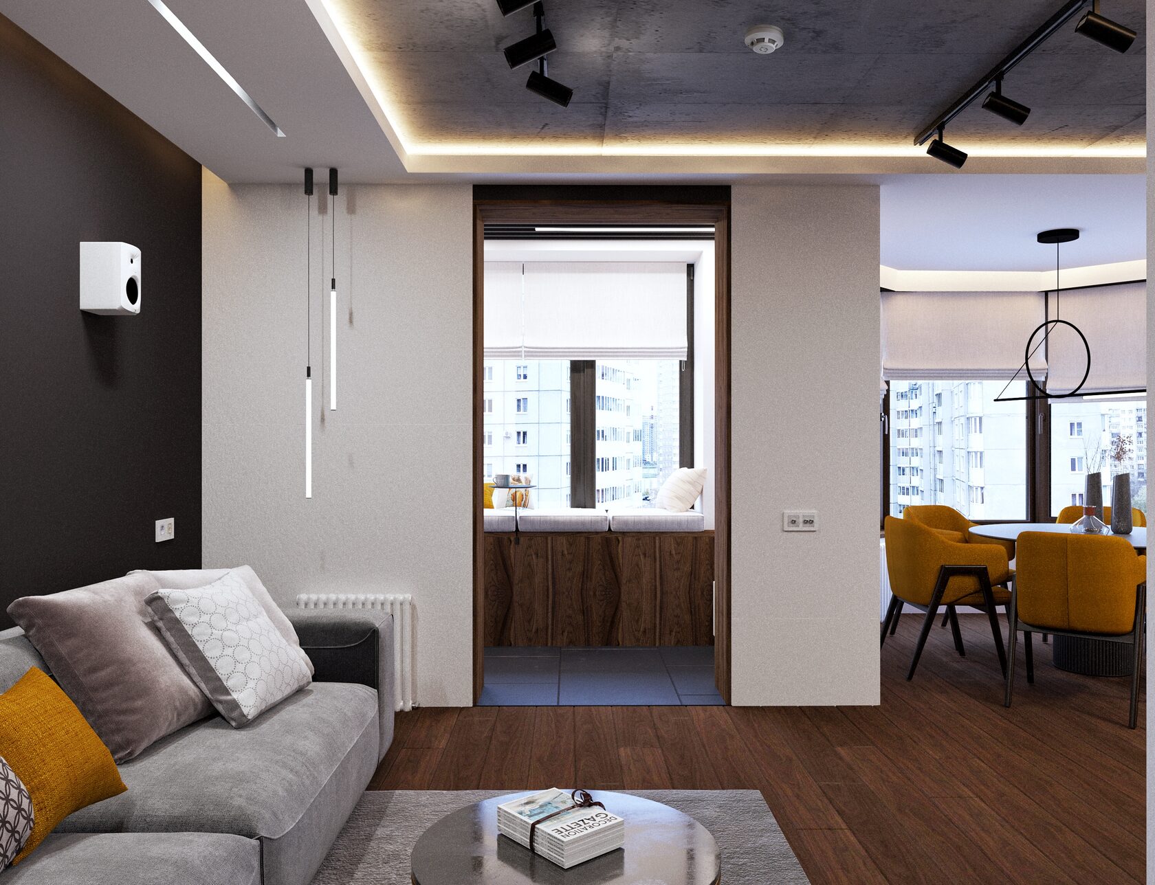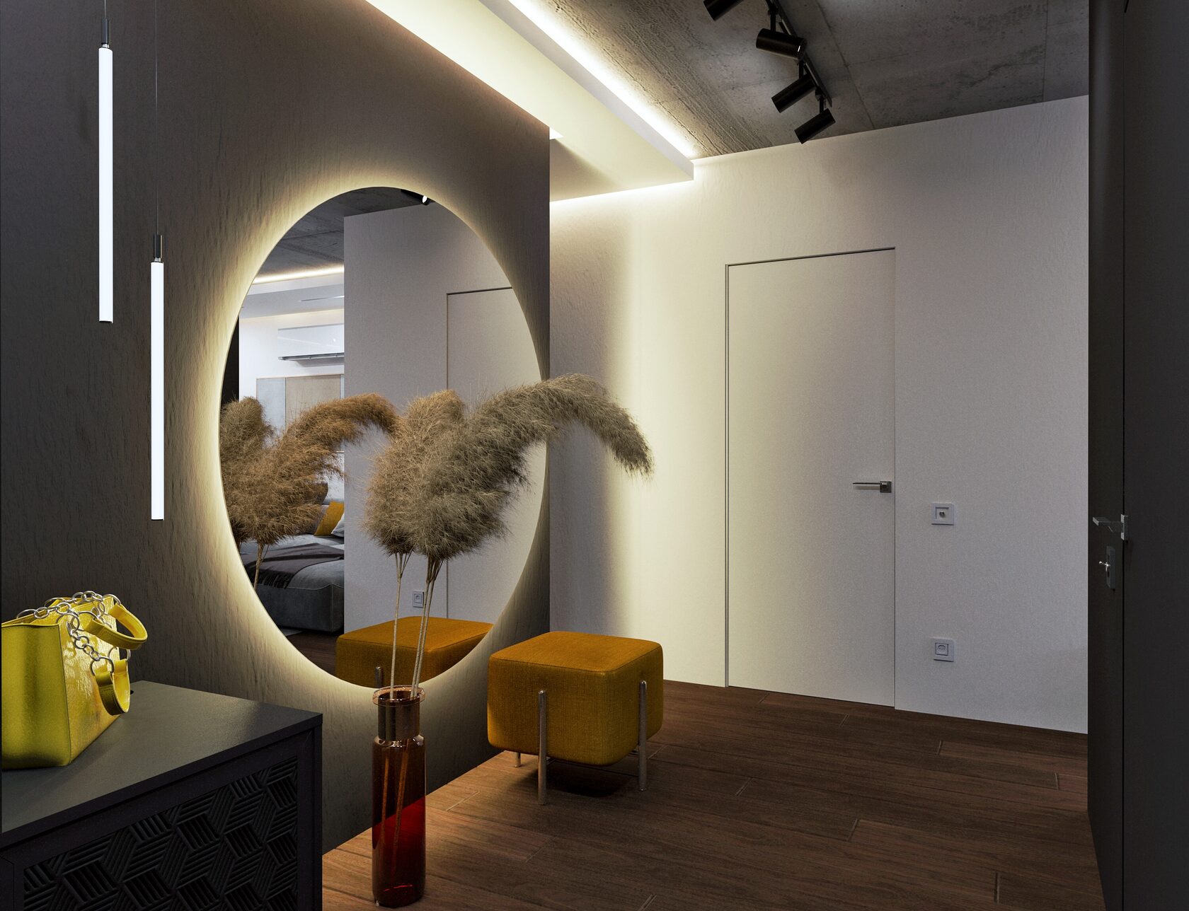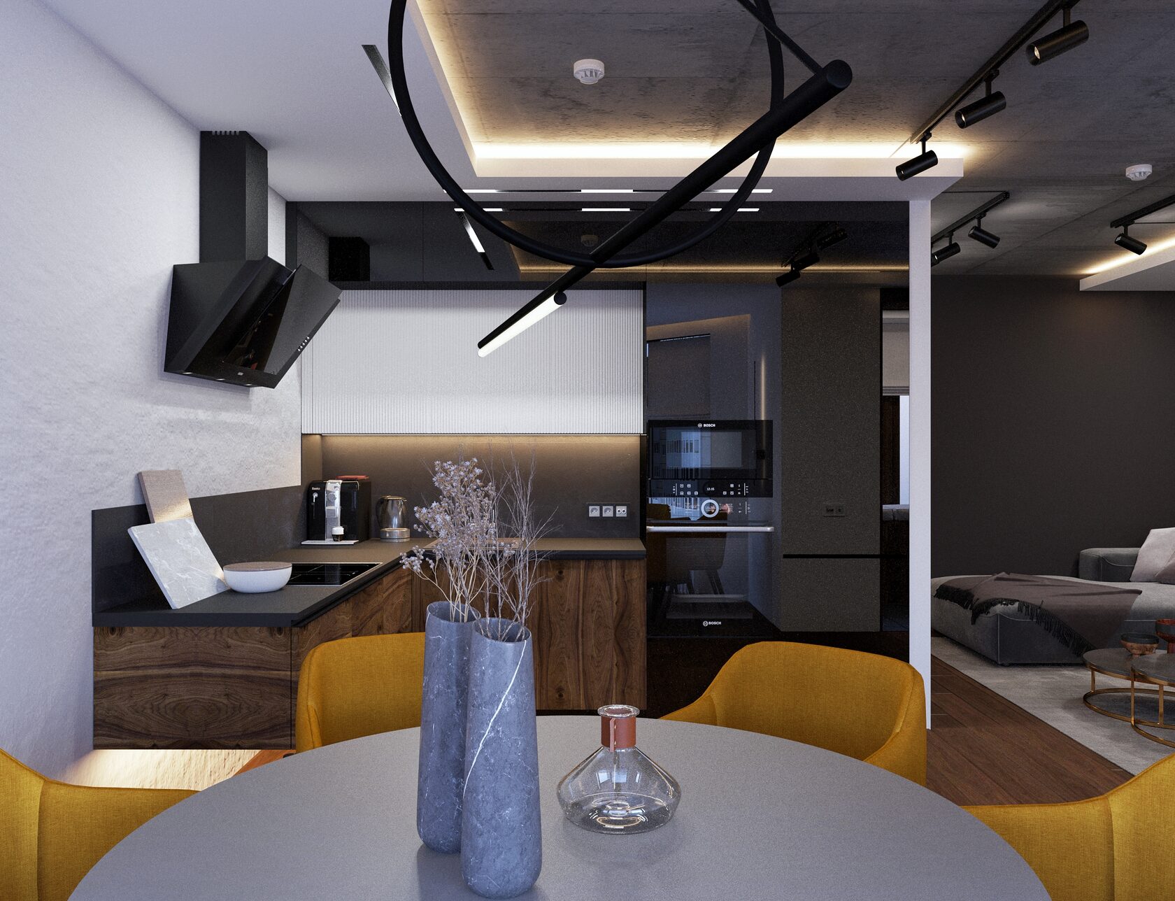 Открытый бетонный потолок, технический свет, дополненный акцентными световыми решениями, темные оттенки графита и ореха, минималистичная геометрия линий – все органично сплелось в интерьере, где с порога чувствуется личность его владельца.